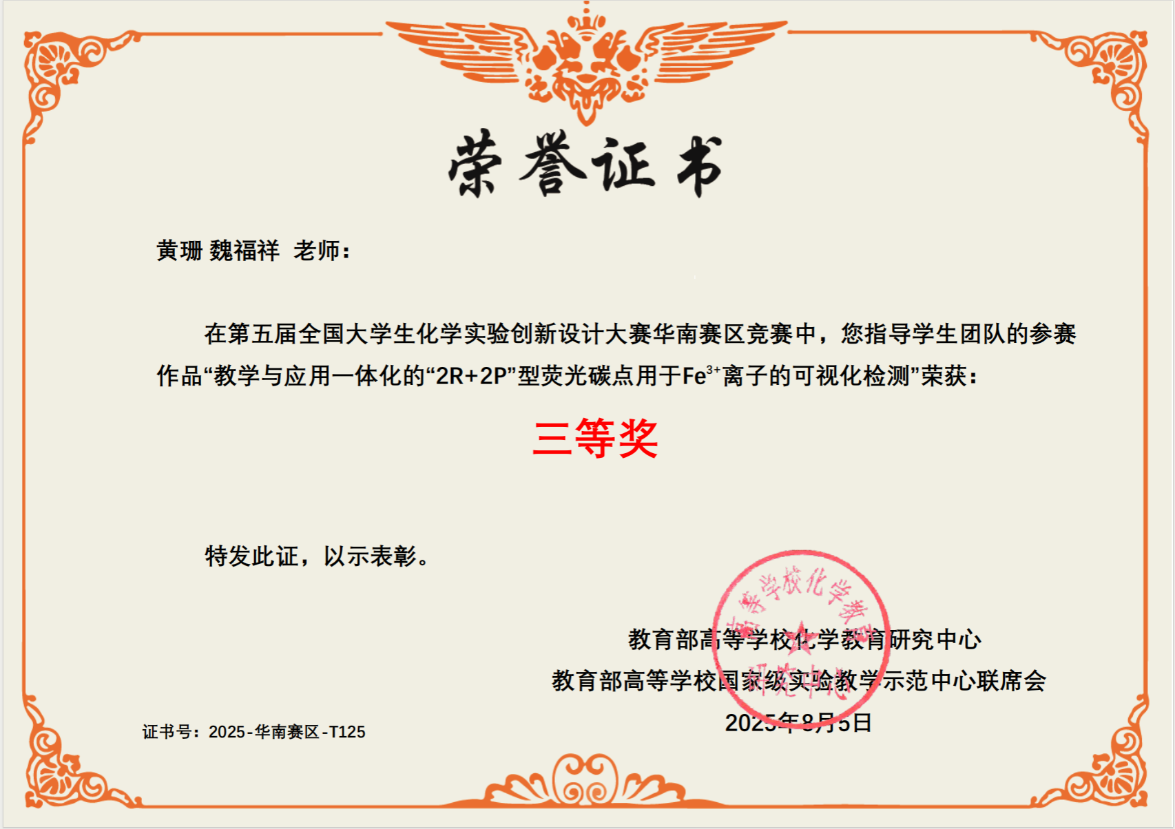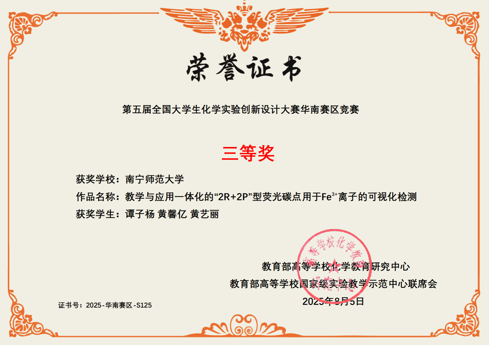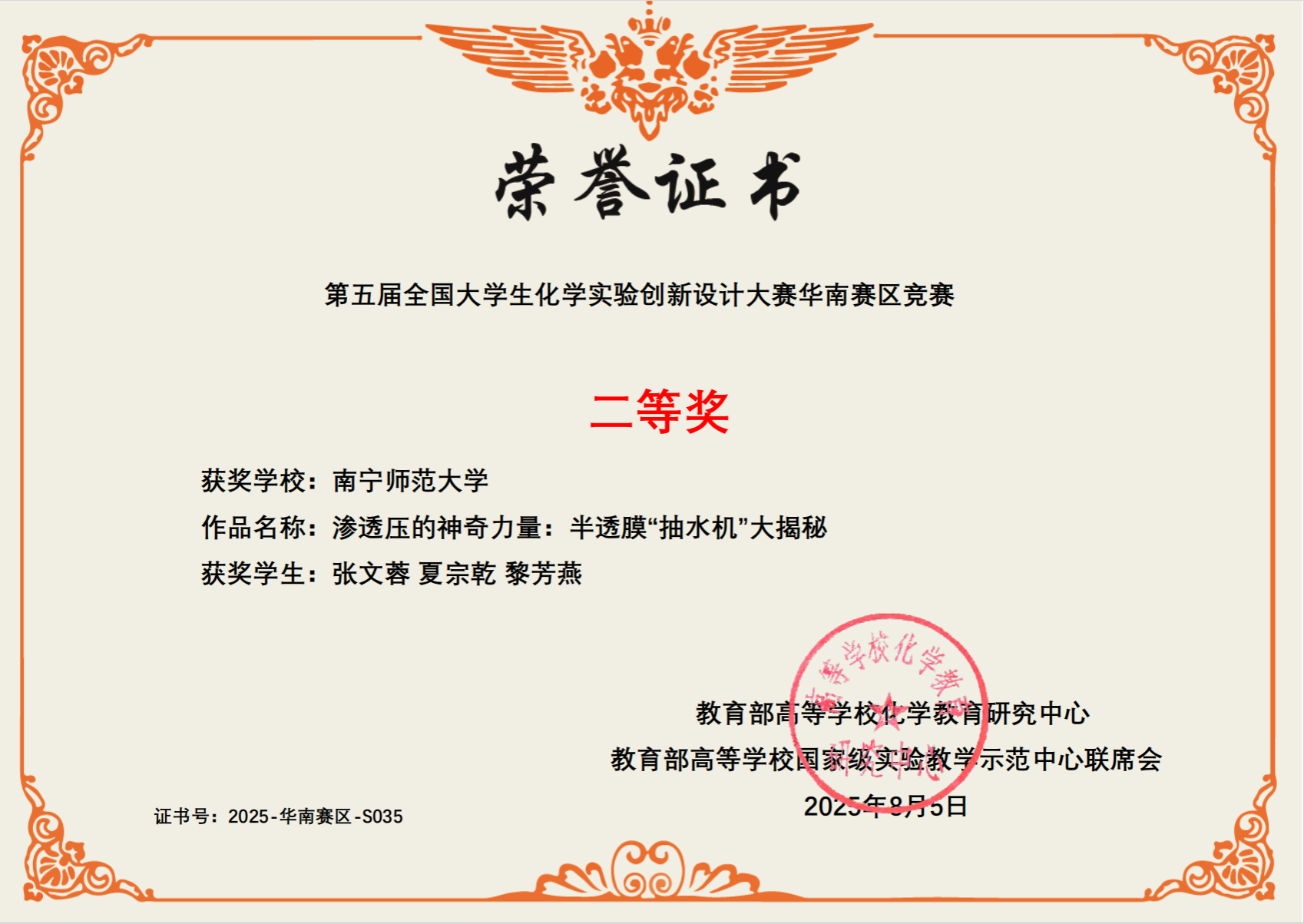 2025年7月25日至7月27日,在桂林举行的第五届全国老员工化学实验创新设计大赛华南赛区比赛中,公司员工张文蓉、夏宗乾、黎芳燕项目《渗透压的神奇力量:半透膜“抽水机”大揭秘》获得二等奖,员工朱雯婷、梁月潭、邓朝馨项目《机械力化学促进Fried-Crafts烷基反应合成1,4-二叔丁基苯》获得三等奖,员工谭子杨、黄馨亿、黄艺丽项目《教学与应用一体化的“2R+2P型荧光碳点用于Fe³⁺”》获得三等奖,莫启进、张丽霞、林陈想、肖军安、黄珊、魏福祥等老师获得优秀指导老师奖。