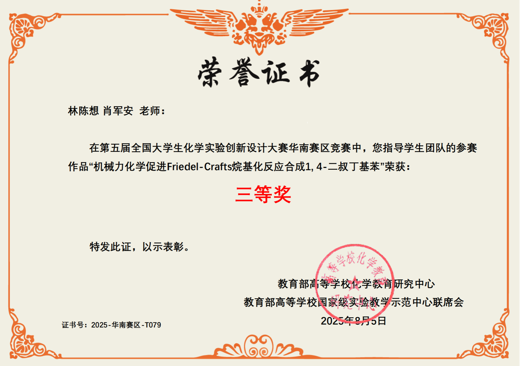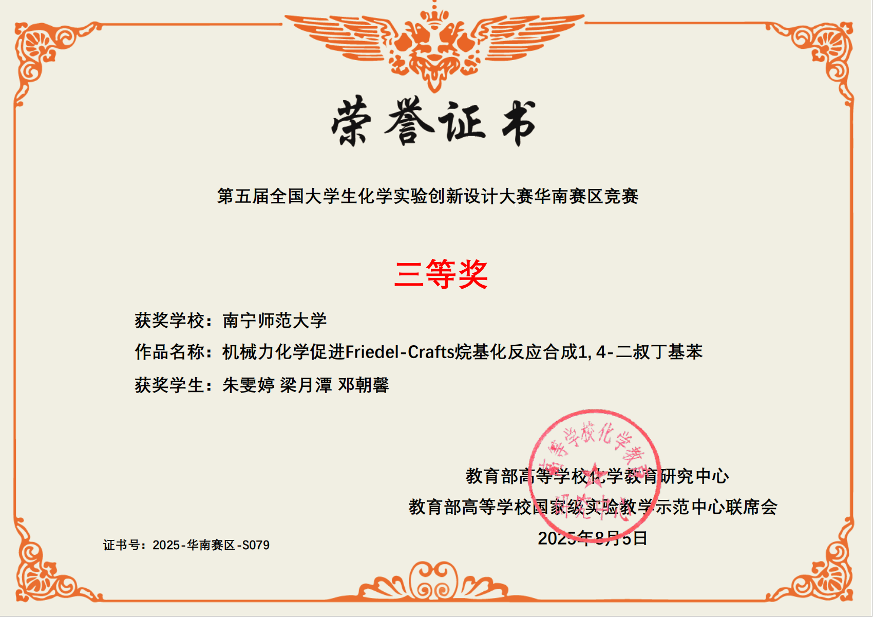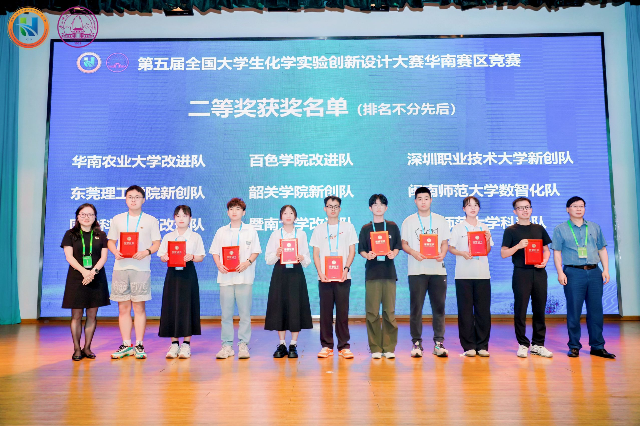 2025年7月25日至7月27日,在桂林举行的第五届全国老员工化学实验创新设计大赛华南赛区比赛中,公司员工张文蓉、夏宗乾、黎芳燕项目《渗透压的神奇力量:半透膜“抽水机”大揭秘》获得二等奖,员工朱雯婷、梁月潭、邓朝馨项目《机械力化学促进Fried-Crafts烷基反应合成1,4-二叔丁基苯》获得三等奖,员工谭子杨、黄馨亿、黄艺丽项目《教学与应用一体化的“2R+2P型荧光碳点用于Fe³⁺”》获得三等奖,莫启进、张丽霞、林陈想、肖军安、黄珊、魏福祥等老师获得优秀指导老师奖。